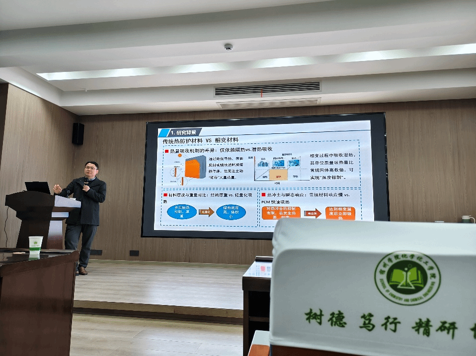朱春宇围绕高/低温相变材料成型机理、封装及热管理等核心内容,系统阐述新型相变复合材料在储能、传热与热安全领域的应用。现场教师就自身研究难点与朱春宇深入交流。