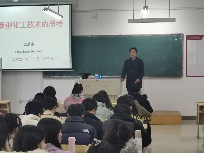 11月23日下午,史洪伟在逸夫楼B210教室为化学工程与工艺专业的同学做了一场《新型化工技术的思考》的报告。