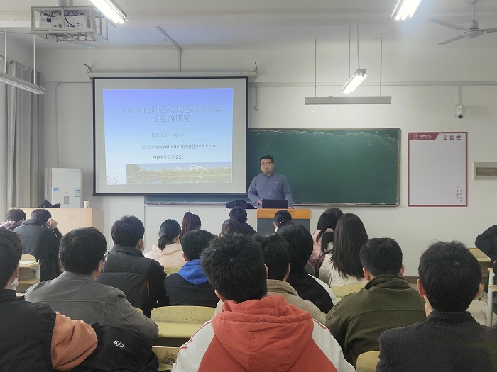 2022年3月25日中午,陈崇在逸夫楼B315教室作题为“多孔炭的制备及其超级电容器性能的研究”的学术报告,化学化工学院部分学生参加了讲座。