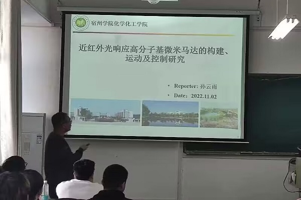 2022年11月2日上午10:05,化学化工学院孙云雨老师在逸夫楼B212为20级化学工程与工艺专业学生作了题为“近红外光响应高分子基微米马达的构建、运动及控制研究”的学术报告。