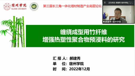 2022年12月23日-25日,第三届长三角一体化增材制造产业高层论坛于在安徽省芜湖市顺利举行,本次论坛由安徽工程大学、繁昌区人民政府主办,采用线上线下结合方式举办。我院郝建秀博士在论坛上作了题为“缠绕成型用竹纤维增强热塑性聚合物预浸料的研究”的学术报告。