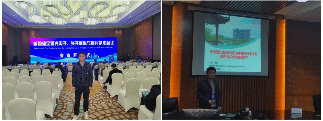 2023年10月21-22日,第四届全国光电子、光子材料与器件学术会议在山东省青岛市顺利举行,本次会议由全国材料与器件科学家智库微电子与光电子材料与器件专家委员会主办,共设置7个分会场,全国400多位专家、学者出席了本次会议。我院张庆博士受邀在大会上作了题为“无外源驱动现场检测汗液中铜离子的可穿戴微流控电化学传感器研究”的学术报告。