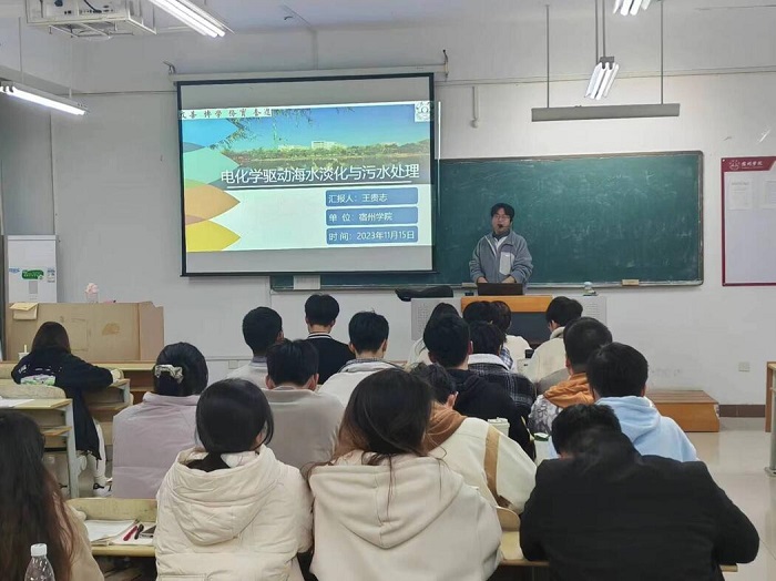 2023年11月15日,化学化工学院王贵志老师在逸夫楼B206作了题为“电化学驱动海水淡化与污水处理”的学术报告。化学化工学院应用化学专业的学生参加了此次学术报告会。