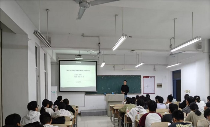 2024年10月22日下午四点三十分,化学化工学院杜军博士在逸夫楼B311开展题为“稀土-镍杂双金属配合物合成及性能研究”的学术讲座,2024级新能源材料与器件专业的学生参加此次学术报告交流会。