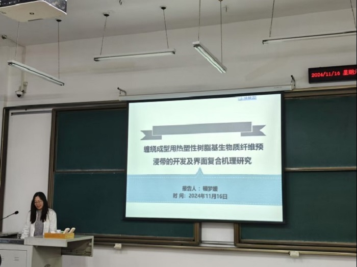 顿梦媛报告了通过“定制”木质纤维和聚乙烯基体之间的柔性界面,显著提高预浸料拉伸强度、冲击强度、耐受缠绕张力和断裂韧性的研究成果,该研究充分利用了木质纤维的材性特点,借助缠绕成型技术极大促进了木质纤维复合材料在多维异型构件上的制备和应用。