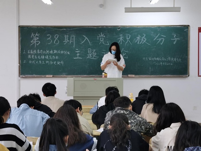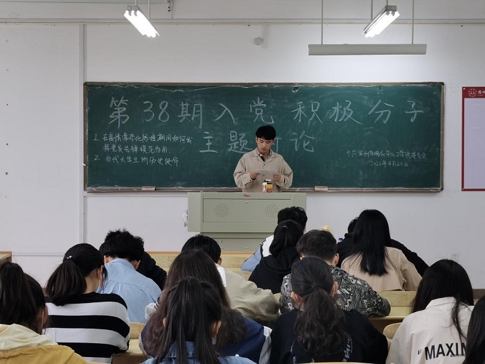 为提高入党积极分子的政治思想觉悟,2022年4月20日下午2:00,第38期入党积极分子培训班在逸夫楼B205顺利开展主题研讨活动。化学化工学院第38期入党积极分子全部参与。
