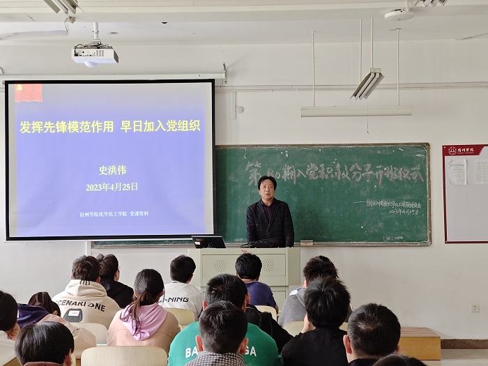 4月25日中午1:00,化学化工学院在逸夫楼B217举行第40期入党积极分子培训班开班仪式,由学院党委书记史洪伟主持,第40期入党积极分子参加。