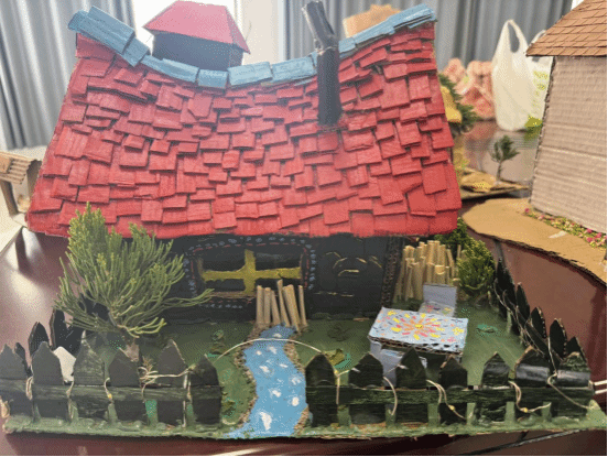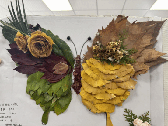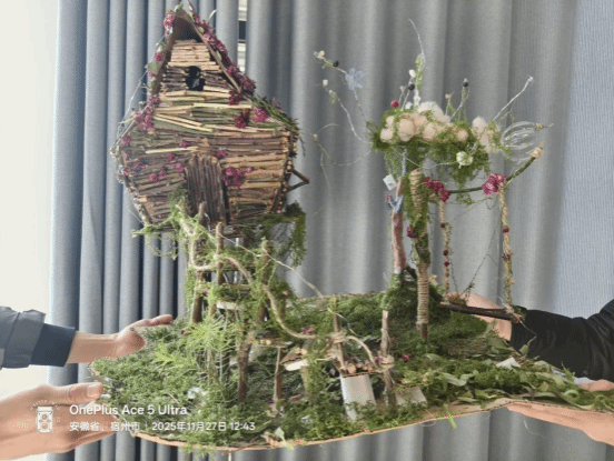 此次大赛鼓励学生以生活废弃物为原料展开创作,将绿色化学理念融入手工艺术。获奖作品中,《杏影花束》以落叶为主体、报纸为包装,尽显秋日清新质感;《森林童话屋》用废弃纸箱碎片搭建房屋,搭配手工围栏与溪流装饰,还原出温馨治愈的童话场景;《火山喷发模型》借助闲置材料塑造火山形态,以废弃棉花模拟烟雾,再用透明蛋糕塑料盒封装,兼具科普价值与视觉效果;《归林蝶》以落叶为蝶翼基底,拼接干花与叶片装饰,让秋日废弃物化作灵动蝴蝶;《雾屿森眠》则用枯枝败叶搭建森系小屋,铺以苔藓“草地”、点缀氛围小灯,营造出静谧浪漫的自然童话氛围。
