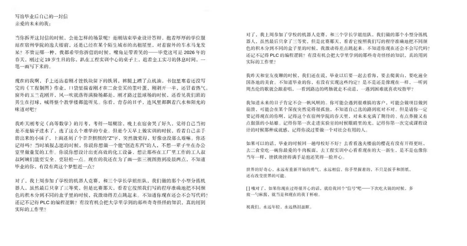 活动启动后,各班级积极动员,全院学生踊跃参与。同学们静心书写,将大学成长期许、学业目标、职业规划与人生追求凝于笔端,在信中回顾初心、立下志向。信笺里,既有对课堂钻研、实验探索、学科竞赛等当下学习生活的点滴记录,也有对校园时光的珍视与成长蜕变的感悟;更有对未来的殷切期盼,立下深耕专业、笃行实干的目标,许下坚守初心、勇担使命的承诺,字字句句传递出不畏挑战、向阳而行的青春力量。