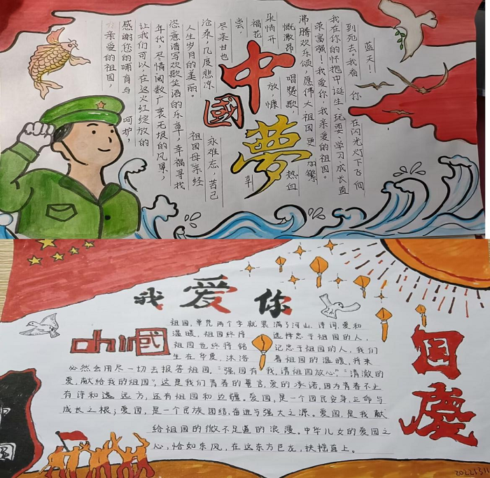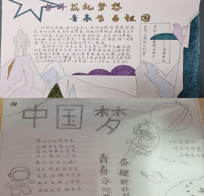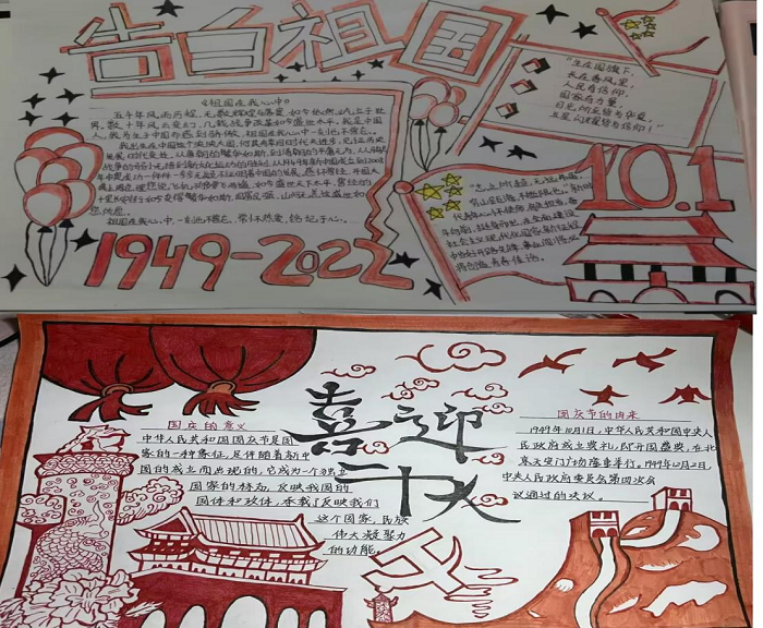 活动中,同学们充分利用课外时间搜集资料,认真准备,精心设计版面,用心编辑图文,有的写,有的画,力求多角度、多层次、全方位展示新中国成立以来伟大祖国在文化、科技、经济、国防等方面取得的重大成就。一笔一画倾注了同学们的爱国情感,彰显爱国热情。