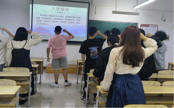 随后优秀团支部书记代表贺晴围绕团支部工作、五四红旗团支部建设以及团员的先锋模范作用等方面作了交流发言,提到了在入团过程中可能出现的一些问题以及解决的方法,并希望新发展团员们能够真正做到思想入团,行为入团,将团员的责任意识内化于心外化于行。最后由王昌旭带领新发展团员进行入团宣誓,并组织老团员重温入团誓词。
