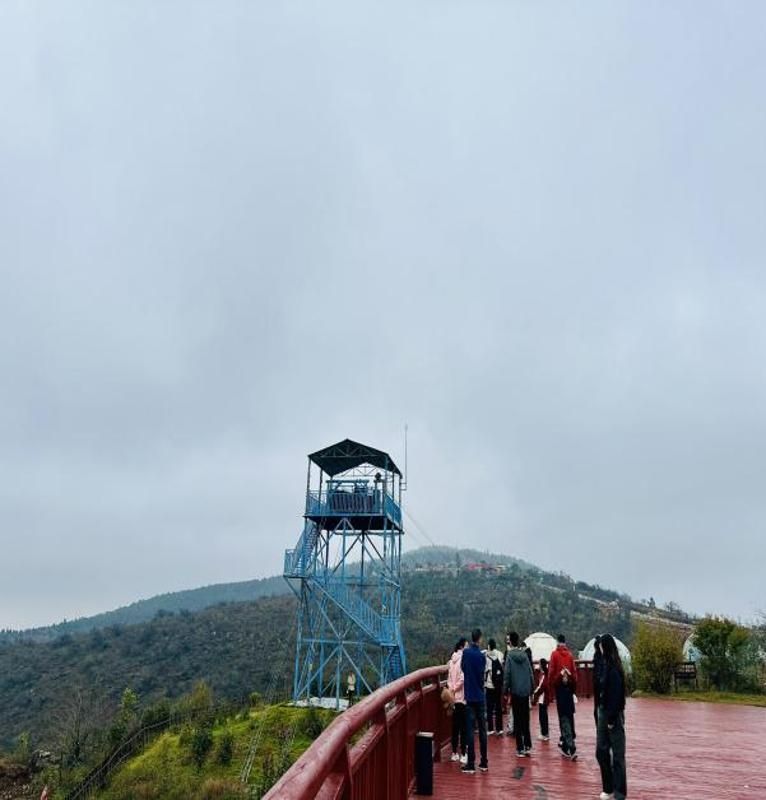 石榴园里,雨后空气格外清新,350余株明清古石榴树枝繁叶茂,虽过了结果期,却仍能从苍劲枝干间想见丰收时节硕果满枝的盛景。午后行程的首站,是近年来火爆自驾圈的“皖北川藏线”核心路段。沿着色彩鲜亮的彩虹公路,道路随丘陵地势起伏延展,彻底打破了大家对皖北一马平川的固有印象。在观景平台,龙吟湖、深山里的飞檐、皖北农家小院映入眼帘,大家纷纷打卡留影,感受这份小众宝藏路线的乐趣。五柳风景区中,呼吸着清新的草木气息,欣赏着漫山遍野的秋日盛景,沿途不时驻足拍照留念,畅谈生活趣事,往日工作的疲惫在自然美景中悄然消散。
