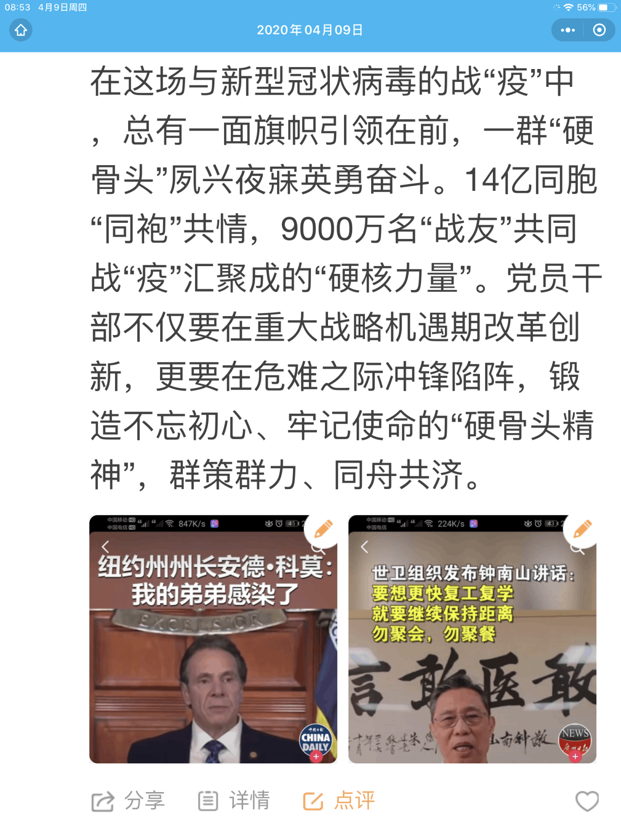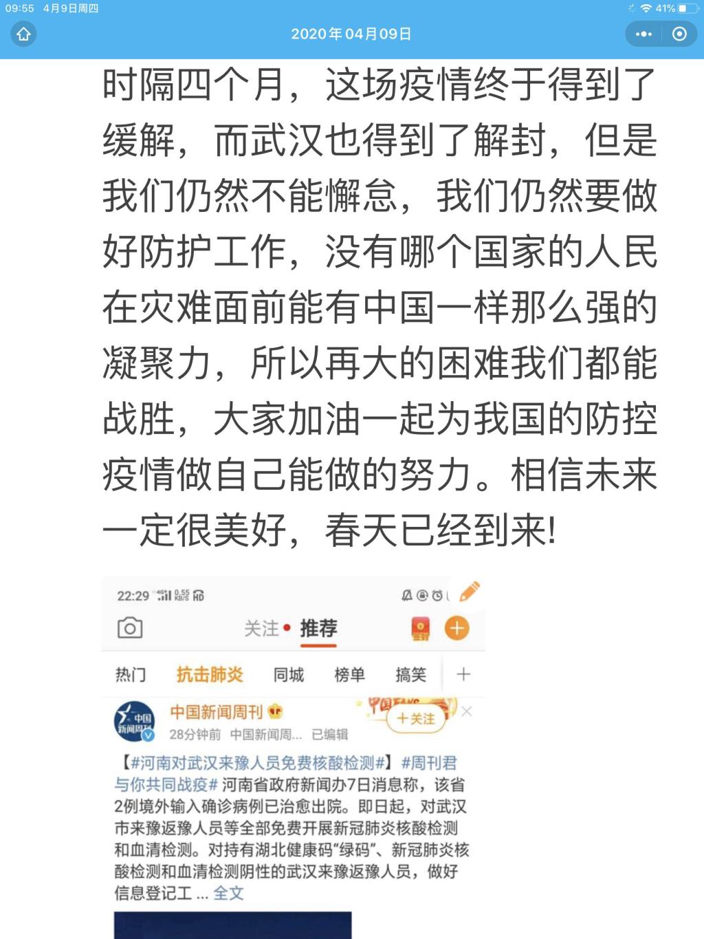 这次虽然只是简简单单的打卡活动,但是在这背后是我们对国家抗疫斗争的支持,我们虽上不了前线,但是这战线的背后我们誓死捍卫,我们必定用爱建立起生命的桥梁传递着中国人民的信心,这是同舟共济,共渡难关的严峻时刻。