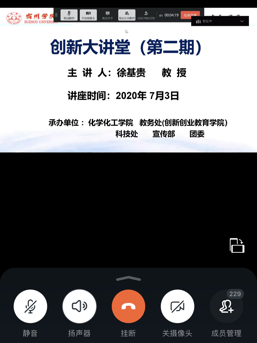 2020年7月3日晚8:00,化学化工学院在“钉钉”组织开展了青年创新大讲堂在线课堂,徐基贵书记做了题为发现“化学之美”,建设“美丽中国”的主题讲座,化学化工学院2018级,2019级全体同学参加。