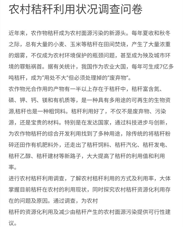 通过调研结果尝试总结出合适的秸秆资源化利用方式从而制定调研计划,分配工作,收集资料,各成员共同决定线上收集资料,在网上收集包括近年来秸秆就地燃烧对环境及土壤的危害,最常见的秸秆处理方法,资源化利用的普及率,目前是否有相关的新技术产生等信息.通过收集的资料展开问卷制作与发布。团队于8月5日开始走访周边农村、村委会、当地政府,发现对于焚烧秸秆的现象与前几年相比已经少了很多,大多是就地掩埋或者带回家,村委会和政府的执行力度也很强,从始至终都贯彻保护环境的理念,禁止焚烧秸秆。