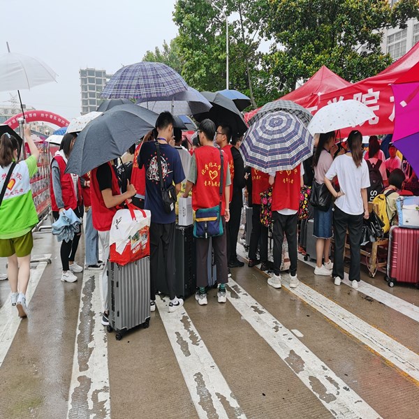 早上六点二十分,志愿者们已经来到迎新地点进行布置,半小时后迎新队伍全部到齐“严阵以待”。我院设置有专门的引导摊位,负责提醒新生填写表格,收集新生的基本信息,并有志愿者负责运送新生行李,同时引导他们顺利抵达各自的宿舍。到了七点时分,陆续有新生来报到。志愿者们有的辛苦的举着院旗接应,有的耐心的接受他们的咨询,有的微笑着带领他们找到各自的宿舍位置……九月的细雨伴着一丝微凉,然而同学们依旧热情高涨。