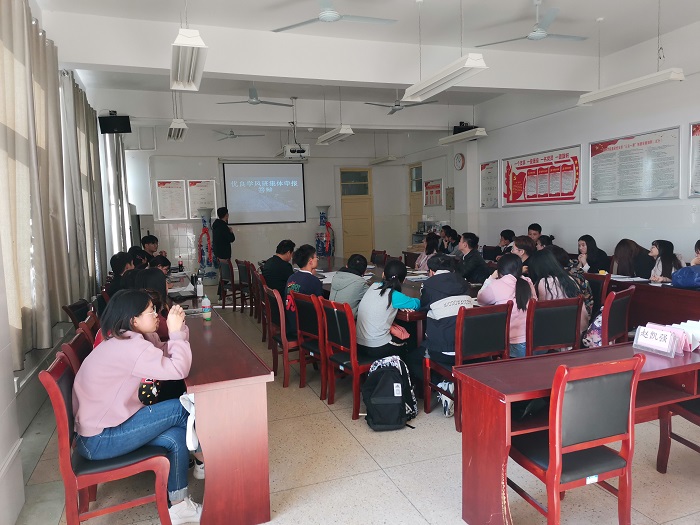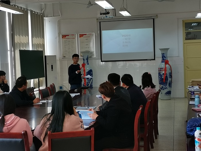 答辩开始后,“三好学生标兵”和“十佳大学生”候选人围绕自己在思想政治、专业学习、课外实践、科研创新、工作实践等方面取得的优异成绩依次上台进行。随后,申请“红旗团支部”和“优良学风班”的班级负责人通过PPT对自己班级一年来的工作进行了总结概括,并对接下来的工作进行了规划。在评审提问环节,各位评委对候选人在学年度获得的奖学金情况、社会实践情况等方面进行了提问。