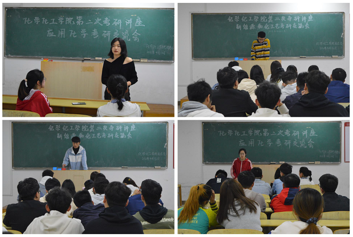 为进一步加强同学们对研究生入学专试的认识,了解前沿的就业形势、增强专研斗志。2021年4月12日晚上七点,化学化工学院在逸夫楼B307,B308,B311教室举办了本学期第二期考研交流会。
