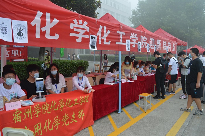 2021年9月11日,化学化工学院于宿州学院东区学海路开展迎新工作。化学化工学院党委副书记史洪伟、院长卓馨、副院长王聪、副书记刘茜及2021级新生辅导员亲临现场指导工作,学生会成员与迎新志愿者们在新生接待处等候,带领新生顺利报到。