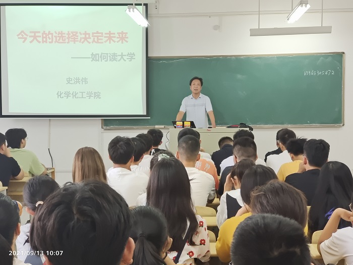 为帮助新生尽快融入大学生活,树立学习目标和专业意识,教育引导新生做好学业生涯规划。按照学校关于2021级新生入学教育的总体要求,化学化工学院于9月13日在逸夫楼B楼开展专业思想及学习方法教育活动。院党委副书记史洪伟、院长卓馨、副院长王聪和教研室主任谢永及全体2021级新生参加。