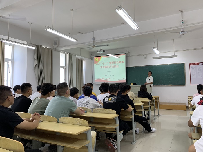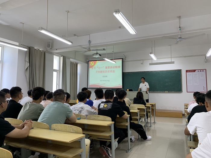 史洪伟主要围绕学习“七一”重要讲话精神开创新的历史伟业方面向新生展开介绍,让同学们了解了党的政治宣言和行动纲领,党的新思想、新观点、新要求,以及党对我们的殷切期望与对我们的伟大号召,深刻认识到中国共产党团结带领全国各族人民进行的革命、建设、改革实践是爱国主义的伟大实践。号召同学们要为实现人民对美好生活的向往不懈而努力,引导同学们爱国、励志、求真、力行,为做社会主义核心价值观的坚定信仰者、积极传播者、模范践行者而努力,为党和人民争取更大光荣!