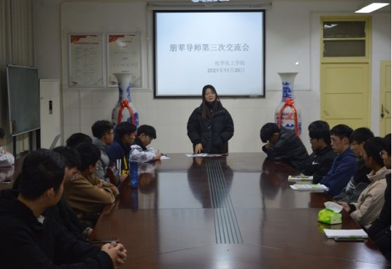 为了加强新生、朋辈导师和辅导员之间的联系,及时准确掌握新生目前出现的问题和困惑。化学化工学院于11月30日晚在实验楼A楼会议室召开第三次“朋辈导师”交流会,会议由辅导员阚淑锦主持,各班新生代表参加。