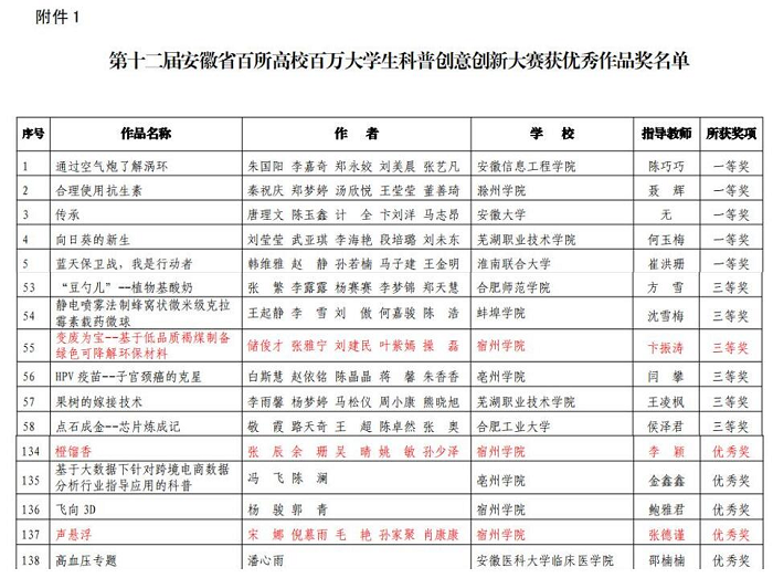 12月4日,第十二届安徽省百所高校百万大学生科普创意创新大赛决赛在安徽建筑大学举行。本届大赛的主题是“科技传播与创新创业”,共有72所高校2973人参赛,征集参赛作品2269件,经预赛、复赛、网络投票和决赛等评审环节,评出优秀科普作品共210项。化学化工学院推选参赛项目《变废为宝--基于低品质褐煤制备绿色可降解环保材料》(指导老师:卞振涛,负责人:储俊才)荣获省级三等奖、《橙馏香》(指导老师:李颖,负责人:张 辰),《声悬浮》(指导老师:张德谨,负责人:宋 娜)荣获省级优秀奖,实现了化学化工学院学子参加此类赛事的再突破。