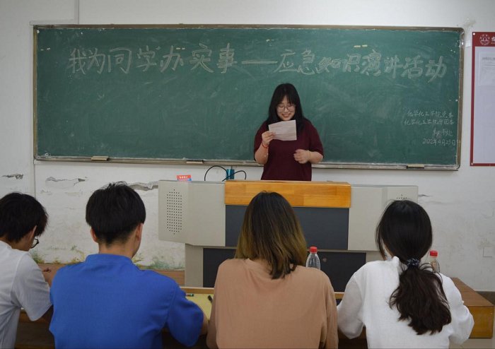 为提高同学们的安全意识,共建平安校园。化学化工学院于4月23日下午,在逸夫楼B307开展以“我为同学做实事”为主题的应急知识演讲比赛。
