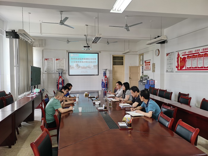顾春介绍其公司发展历程、产业现状,公司产品的主要应用领域,重点介绍了企业发展中的瓶颈问题。他期望与化学化工学院开展相关技术攻关,提高企业的竞争力。郭文武就公司具体产品中乙酰呋喃、精品DM的生产工艺控制与精细化操作等问题与参会教授、博士教师进行交流,得出初步解决问题的技术构思和方案。
