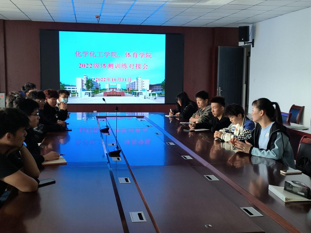 为正确引导化学化工学院2022级大学生体质测试训练,提高学生体质测试成绩,10月31日,化学化工学院在实训楼A10楼会议室召开2022级大学生体质测试培训对接会。体育学院指导教师李茹,2021级体育教育专业见习生,化学化工学院辅导员马明文以及2022级各班班长、文体委员参加会议。
