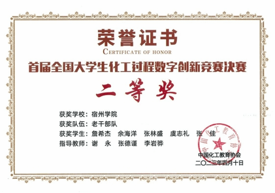近日,由中国化工教育协会主办,南京工业大学承办的首届全国大学生化工过程数字创新竞赛决赛在江苏南京举行。我院由谢永、张德谨、李岩骅指导,詹希杰、余海洋、张林盛、虞志礼、张佳组成的“老干部”团队荣获全国二等奖。