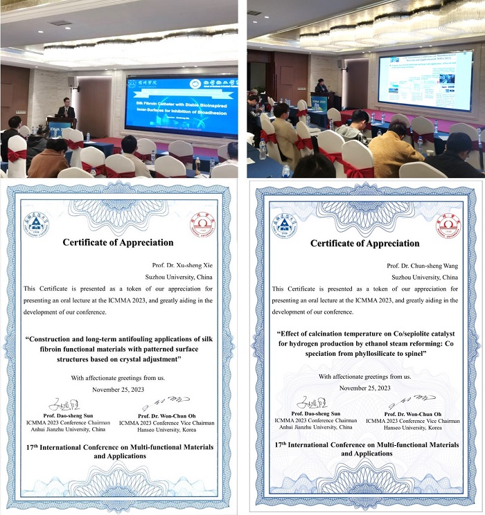 大会报告阶段,中国科学技术大学俞书宏教授、泰国朱拉隆功大学Junjuda Unruangsri教授、韩国韩巴大学Chang-Min Yoon教授分别就各自研究方向作了精彩的学术报告。其中,我院汪春生博士和谢旭升博士分别做了题为《“Effect of calcination temperature on Co、sepiolite catalyst for hydrogen production by ethanol steam reforming: Co speciation from phyllosilicate to spinel》、《Construction and long-term antifouling applications of silk fibroin functional materials with patterned surface structures based on crystal adjustment》分会场报告。