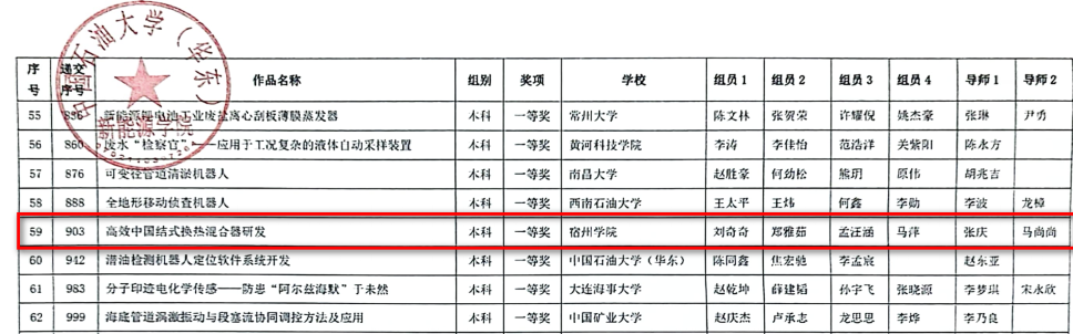 8月24日至25日,由中国机械工程学会和教育部高等学校机械学科过程装备与控制工程专业分委员会主办,中国石油大学(华东)承办的2024年第十五届中国大学生机械工程创新创新大赛“卓然-笃舜-宏图杯”过程装备实践与创新赛圆满完成各项赛程。大赛经过区域赛选拔、网络评审、专家会评、专家主审、小组讨论、评审合议、现场展示等竞赛环节,我校学子从2965个团队中脱颖而出获得全国一等奖,创造我校参与该项赛事以来的最好成绩。