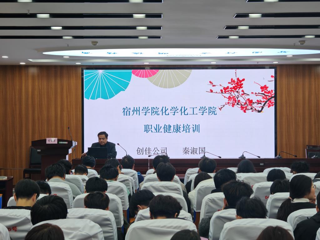 2024年11月19日,化学化工学院于实训楼B117举办了“五育双创”大讲堂活动,邀请了安徽创佳安全环境科技有限公司总经理秦淑国做了题为“职业安全与健康”的专题报告。报告会由化学化工学院副院长王聪主持,化学化工学院2022级全体同学参加。