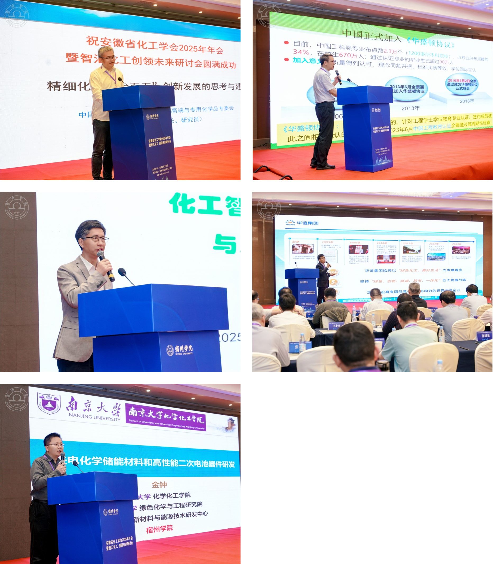 会议期间,中国石油和化学工业联合会李文军、中国化工教育协会唐旭华、天津渤海化工集团汤吉彦、上海化工研究院赖春波和宿州学院学术副校长金钟分别以“精细化工‘十五五’创新发展的思考”“化工类专业工程教育认证与培养方案修订”“化工智能工厂建设与人才培养思考”“加强双功能平台建设,实现创新链与产业链的融合”“先进电化学储能材料和高性能二次电池器件研发”为题作大会主旨报告。