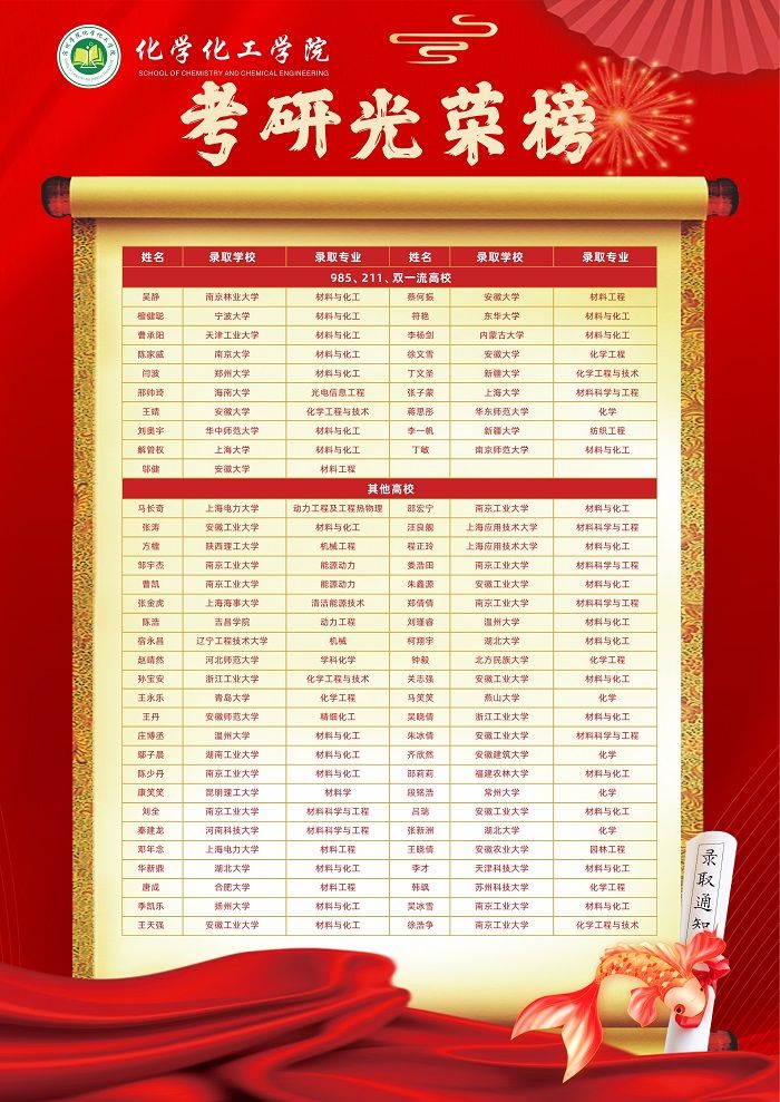 春风化雨育桃李,硕果盈枝捷报传。化学与化工学院2025届毕业生在2025年全国硕士研究生招生考试中再创佳绩,282名本科生中65人考取研究生,升学率达23%,其中16人被南京大学、华东师范大学等985、“双一流”高校录取,彰显学院卓越育人成效。