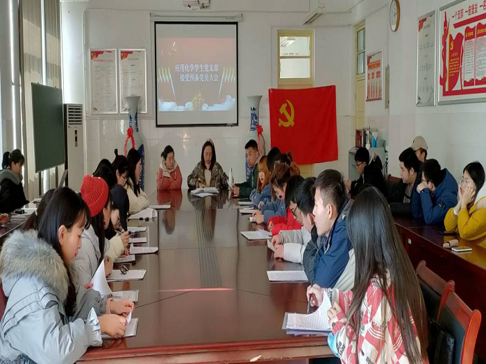 2020年12月18日中午,化学化工学院应用化学党支部在实验楼A401召开接收预备党员大会,应用化学党支部全体成员参加了会议。