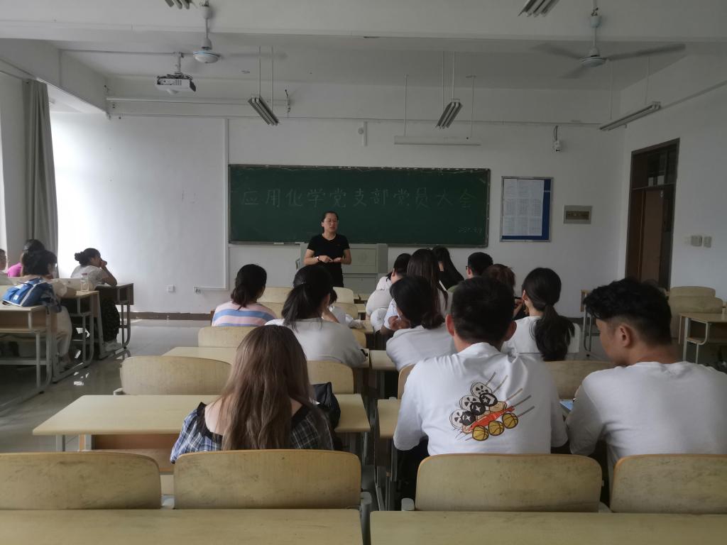 2020年9月9日,化学化工学院应用化学党支部召开了应用化学党支部党员大会,主讲人为郭萍倩老师,参会人员为应用化学全体党员。这是在因疫情原因推迟开学后第一次召开线下会议,大家都戴着口罩参加这次会议。