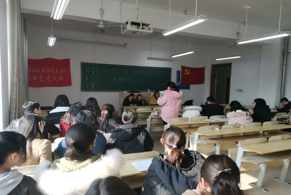 窗体顶 2019年12月29日,化学化工学院化学工程与工艺学生党支部在逸夫楼B319教室召开预备党员转正大会。大会由团总支书记李雪莲老师主持、党支部全体成员参加。